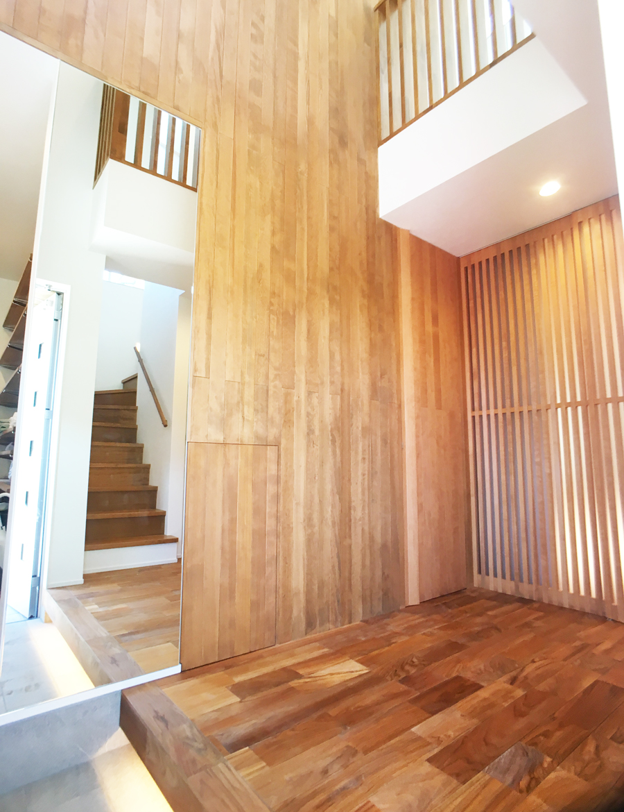 1)玄関に上に伸びる吹き抜けを設計し開放感を作り出す。
