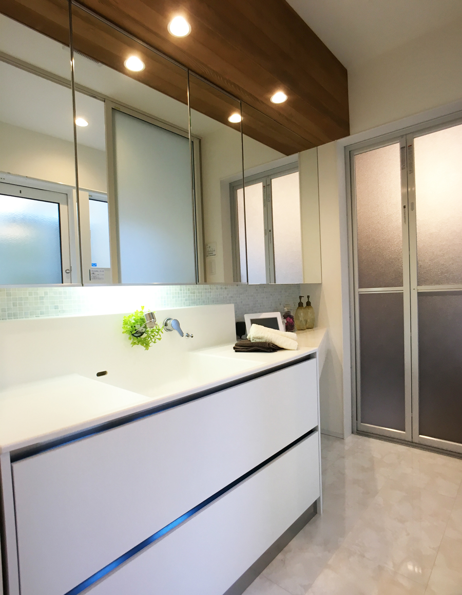 2)大きなミラーが室内に広がりを生み、壁面の虹色に輝くモザイクタイルがアクセントになる。