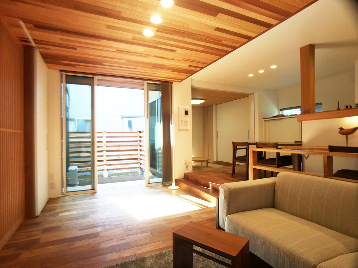 建物によって周囲からの視線を遮られ、プライバシーの保たれた「使える庭」。中庭からの光に包まれ、床・壁に貼られた無垢材の質感が毎日を豊かに彩ります。この機会に、ぜひディテールクオリティの住まいをご体感ください。