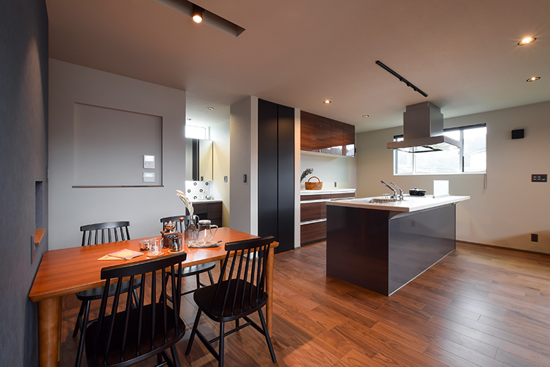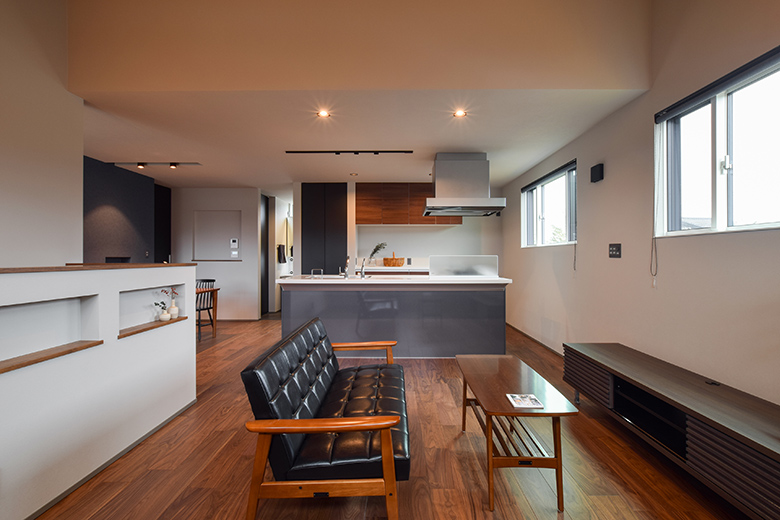 三条市|ブラックタイル×ウォールナットの床が魅せる、シックな23帖リビング|完成見学会【予約制】