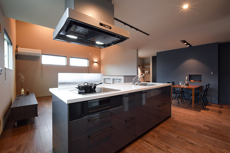 階段から勾配天井を配したリビングへのつながり方や、アイランドキッチン、趣味のバイクを複数台格納するだけでなく、整備もできる広さを確保したガレージなど、見どころ満載です。