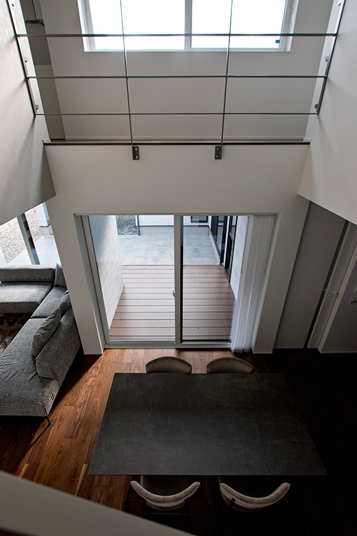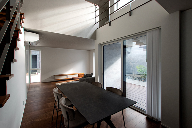 吹き抜けを家の中心に配置し、採光をふんだんに取り入れた明るい日差しが差し込むダイニング。