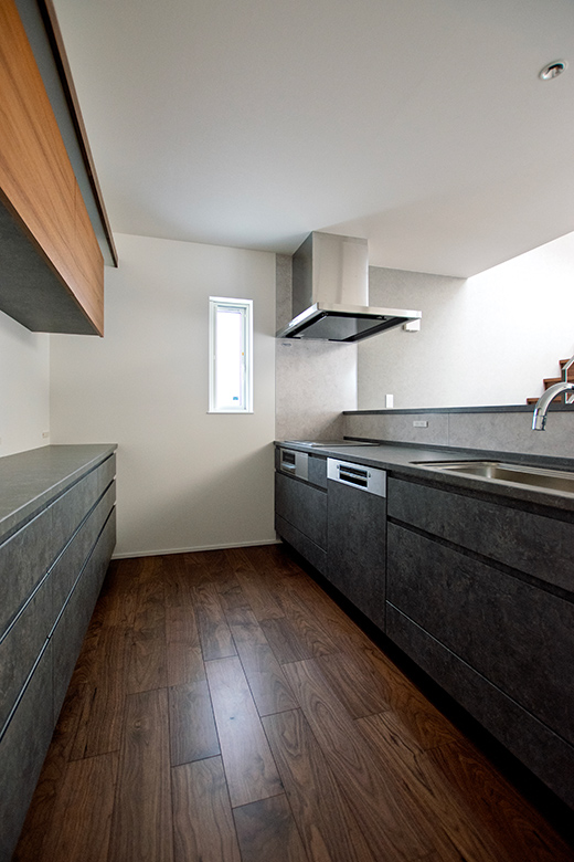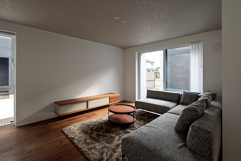 三条市|ブラックタイル×ウォールナットの床が魅せる、シックな23帖リビング|完成見学会【予約制】
