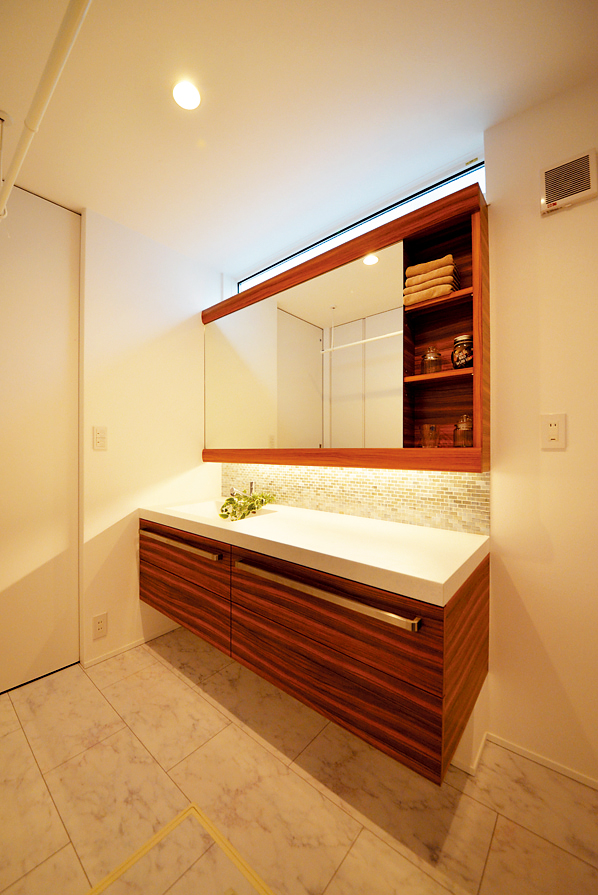 モザイクタイルと間接照明が上品な印象の清潔感あふれる造作洗面化粧台