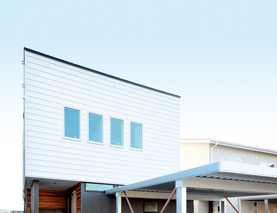 ホワイトのガルバリウム鋼板をベースに無垢材を組み合わせた外観デザイン