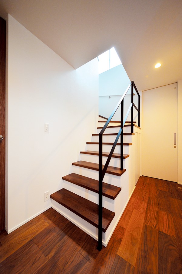 ウォールナットの階段にブラックのアイアン手すりで解放感とかっこよさを演出