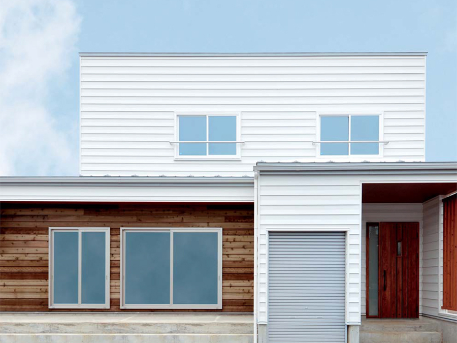 金属系の真っ白い外壁にインパクトのあるレッドシダーの組み合わせでシンプルモダンな外観に。