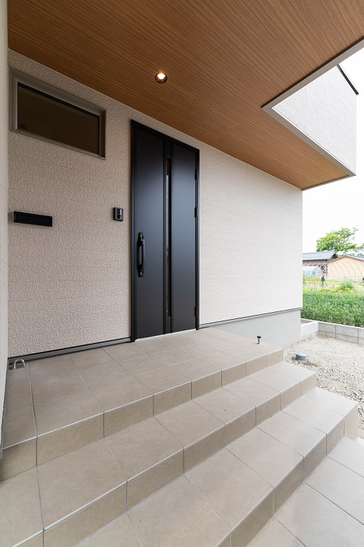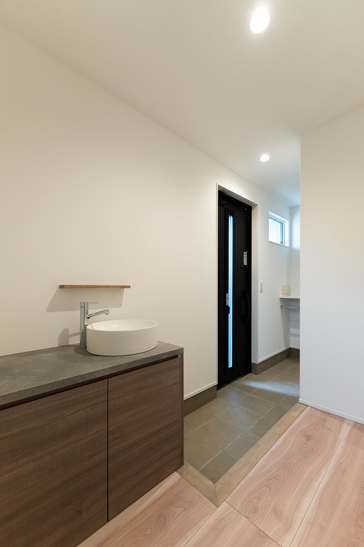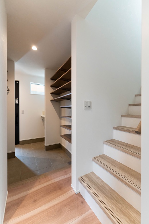 家族用玄関には、コートや傘もかけられる十分な収納スペース。靴を脱いだらそのまま2階のLDKへ
