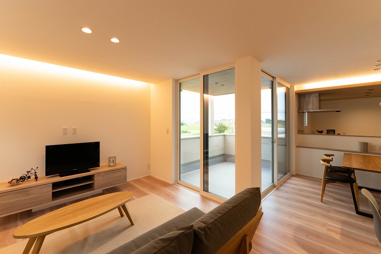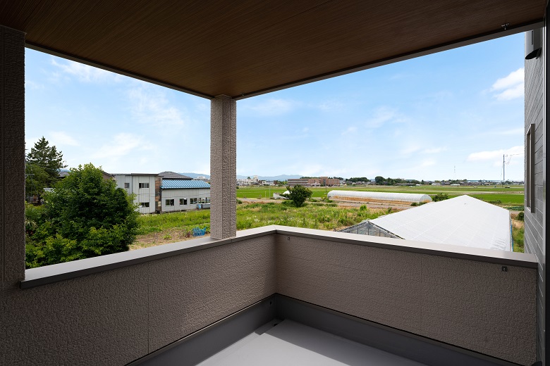 バルコニーを中心としたL字型LDK。リビングから眺める景色は、道路からの視線を遮り、田畑を一望できる