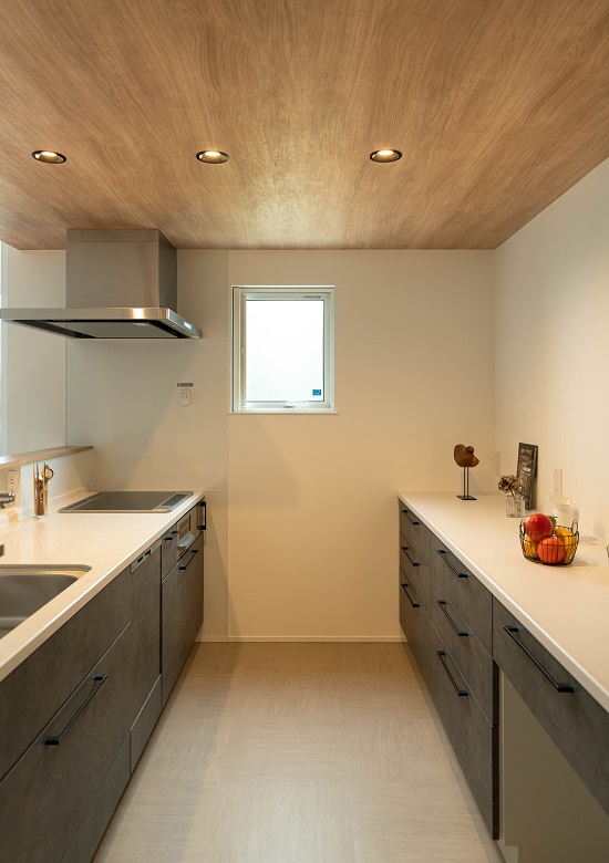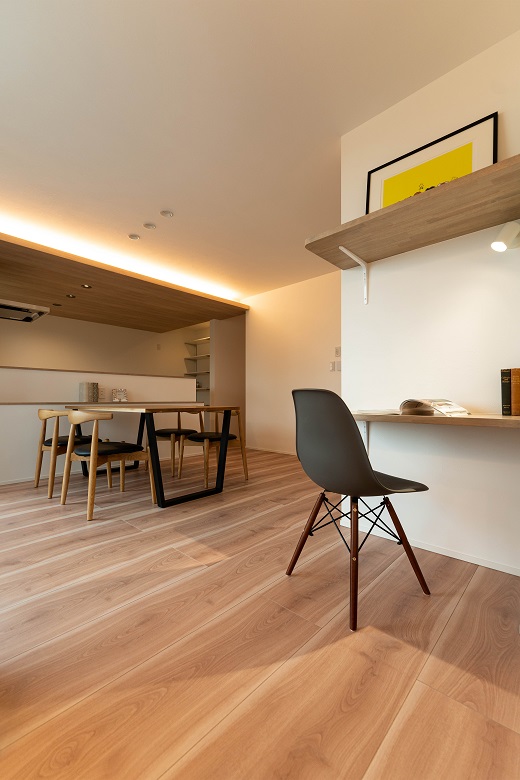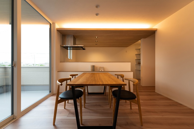 キッチンの天井を下げ、間接照明を仕込むことで、あたたかな空間を演出