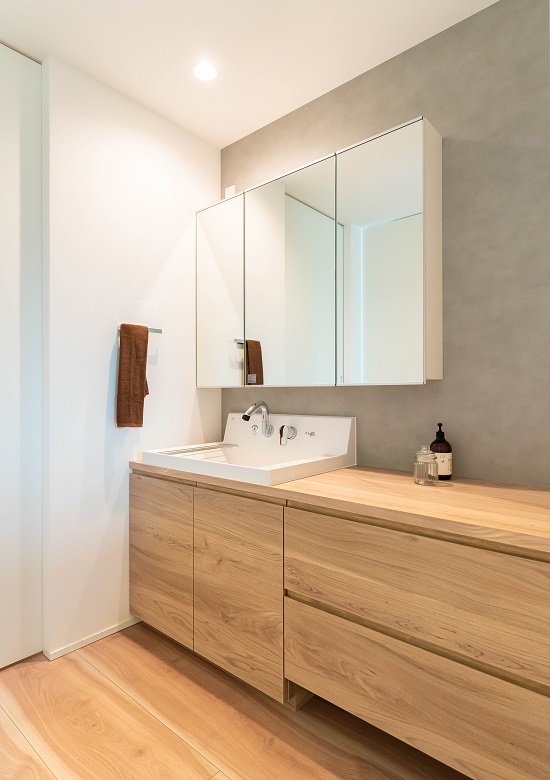 ゆったりと身支度ができる洗面台。収納の下にはお掃除ロボットの基地のために隙間を作った