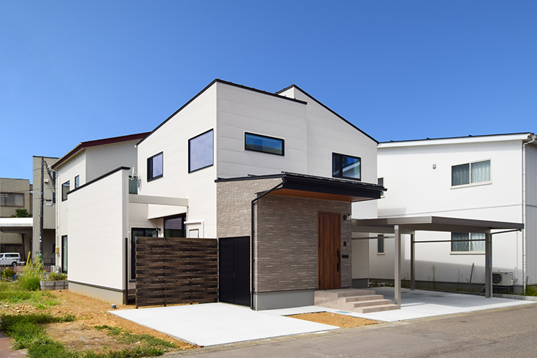 白の金属系サイディングをベースに、玄関周りに窯業系サイディングを使ってアクセントを利かせた外観
