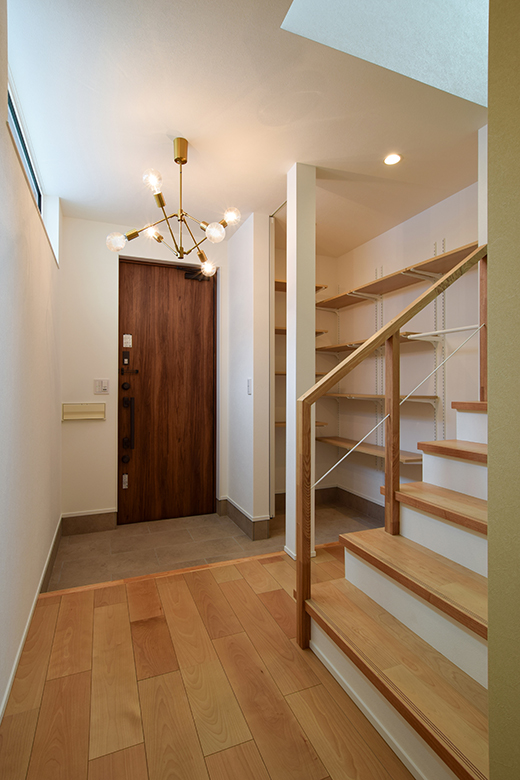 玄関ホールに吹抜けの階段を設け、明るさと広さを感じられる