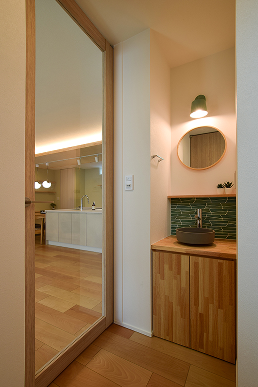 リビングに入る前の手洗いスペース。おしゃれなアクセントタイルや手洗器が彩りを添える