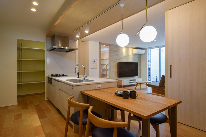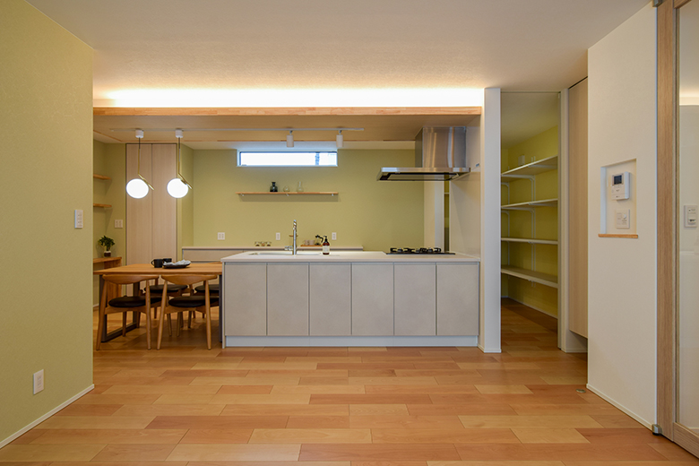 ダイニングキッチンからの眺め。右の扉からは水回り、左はパントリーへとつながり、効率良く家事をこなせる動線