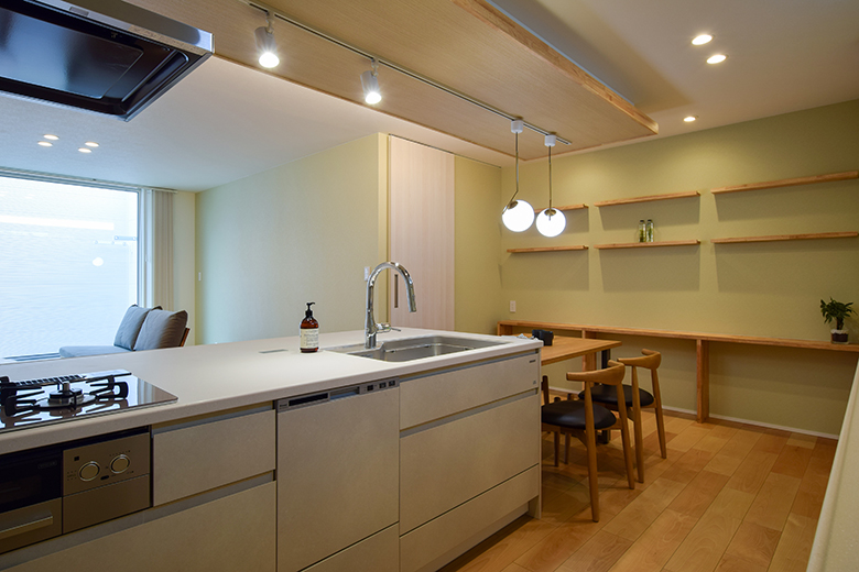 薄緑のクロスや板貼りの天井が優しい印象を与えるダイニングキッチン