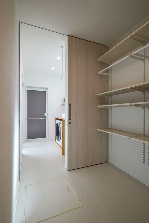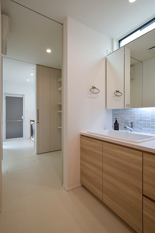 日常の家事をスムーズに行えるよう、水回りが一直線に配置された動線を採用。
