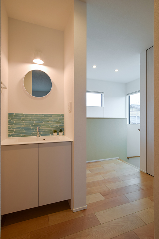 2階ホールの手洗いスペースは1階と統一感のあるタイルや丸型のミラーが印象的