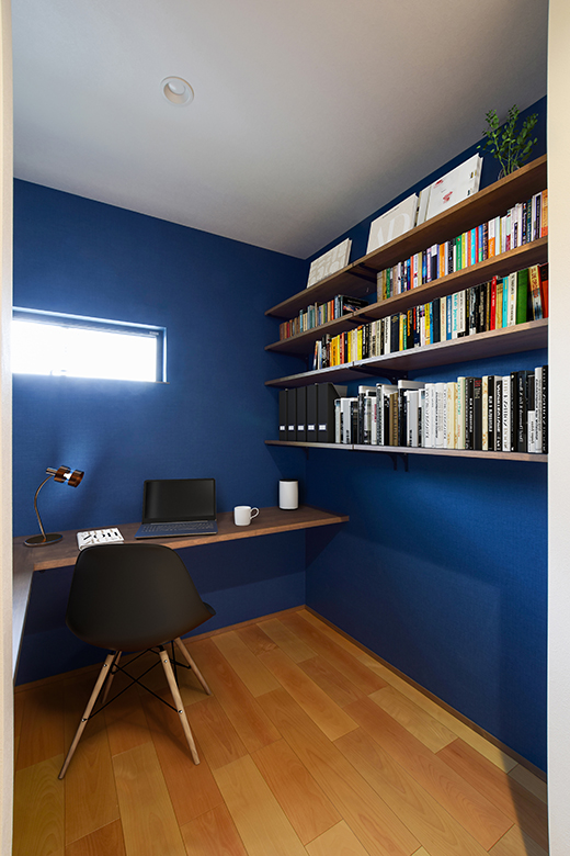 書斎はネイビーのアクセントクロスが落ち着きをもたらし、造作のデスクや大容量の書棚で作業もはかどる