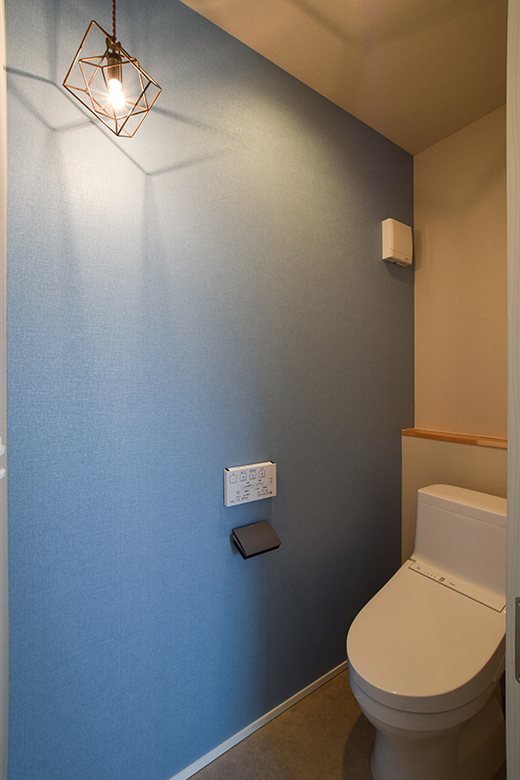 淡いブルーのアクセントクロスが印象的な2階トイレ