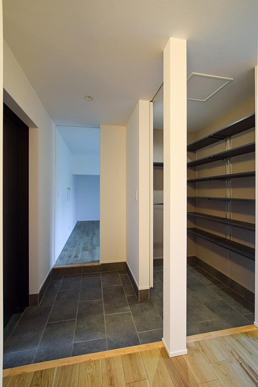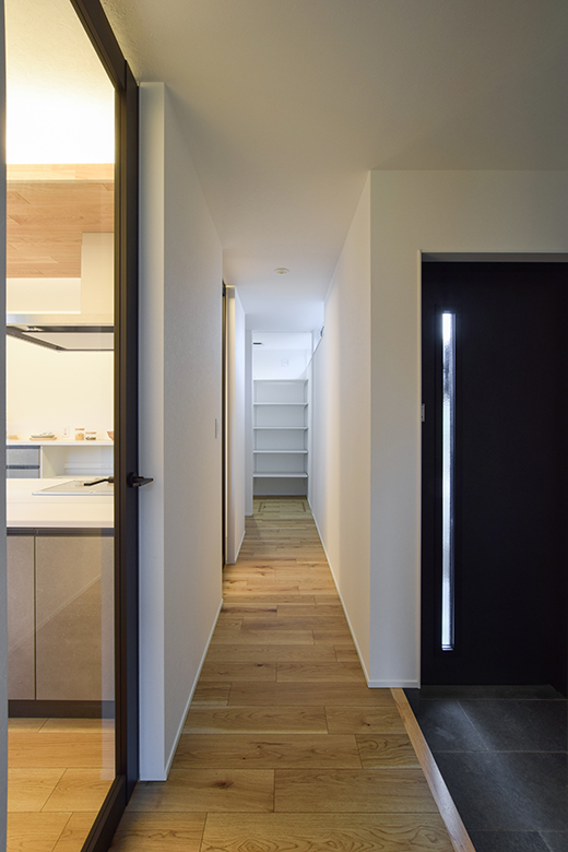 玄関ホールからリビングやキッチンへ直行できるほか、廊下の先にはパントリーもあり、買物帰りなどで重宝する