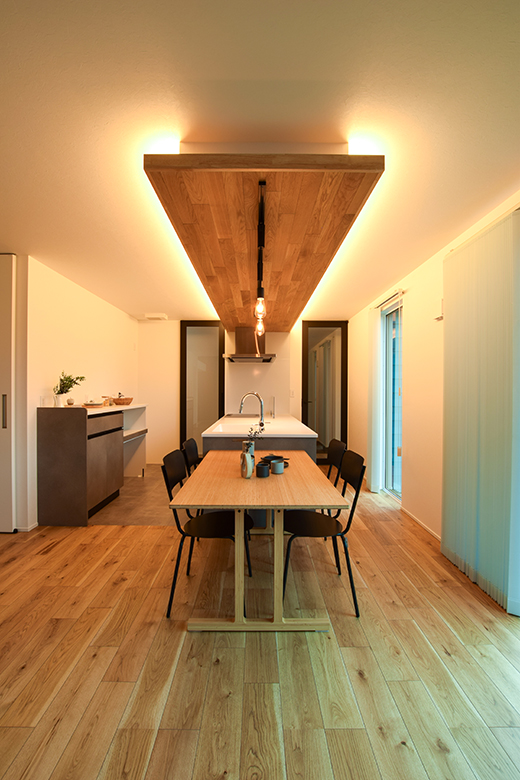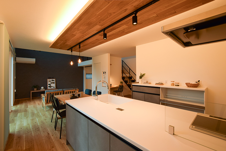 LDKに入るとまず目につくのが、フラットな白い天板で空間をすっきり見せるキッチン。板貼りの天井や間接照明が上質なアクセントに