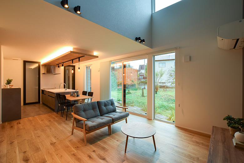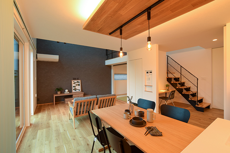 新潟市江南区|1.5階の高天井とカーテンレスのLDKで、海外照明と家具が映える住まい|完成見学会【予約制】