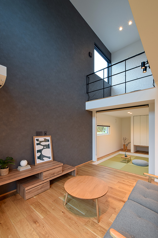 リビングの奥から全体を見渡すと畳コーナーや開放的な吹き抜けも印象的