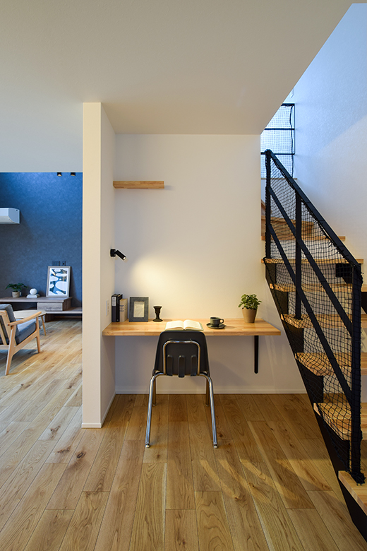 LDKの一角、リビング階段横にワークスペースを設置。学習やPC作業などに集中しながらも家族の気配を感じられる空間