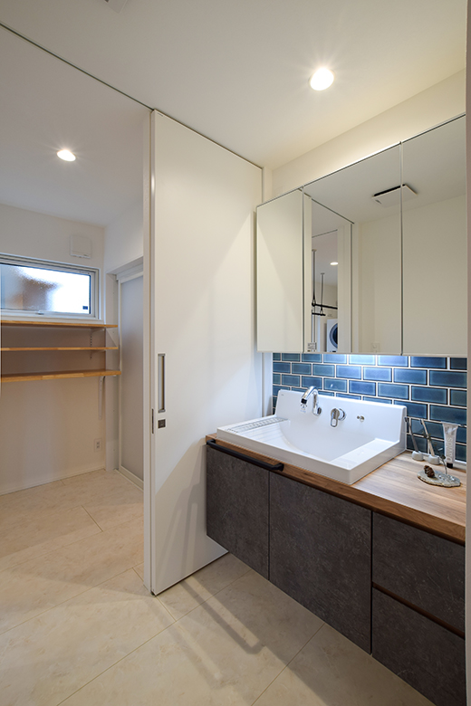 大きめのタイル貼りが個性を彩る造作の洗面化粧台。深みのあるネイビーカラーが空間に程よいコントラストを生み出し、上質な印象を引き立てる