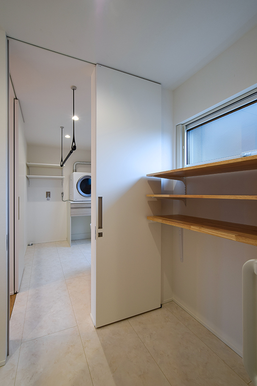 扉で仕切って独立した脱衣室とランドリースペース。造作の可動棚はタオルなどの収納に便利