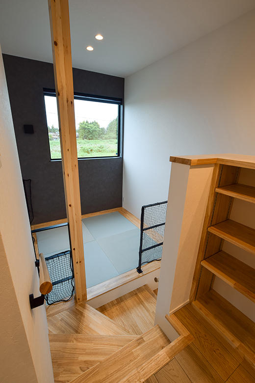 階段の途中に設けられたスキップフロアの畳コーナーは秘密基地のようなワクワク感を与えてくれる