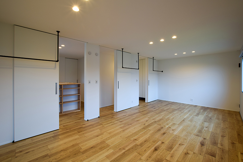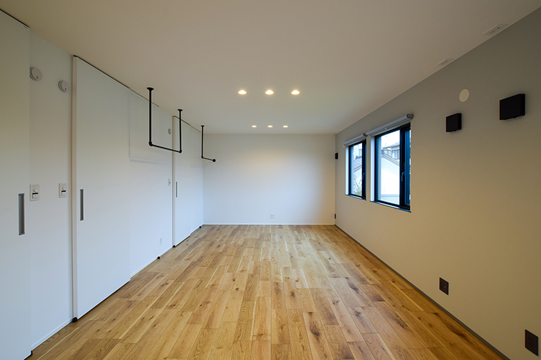 お子様の成長に合わせて間仕切りすることを想定した洋室。天井からアイアンのハンガーパイプを吊るし、簡易的なクローゼットとしても使える