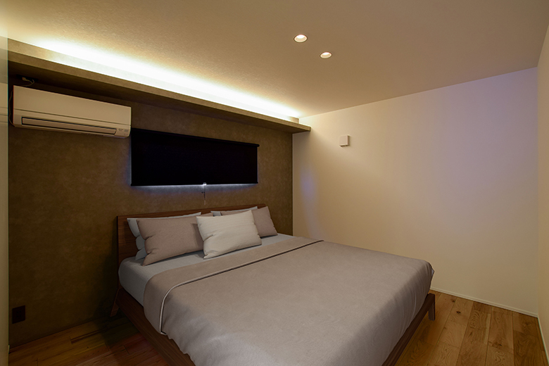 間接照明とモルタル調のアクセントクロスで落ち着きと癒やしを重視した寝室
