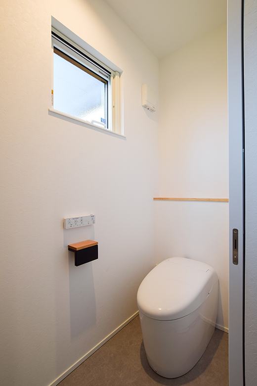 シンプルな中にも木や黒のアクセントを取り入れた1階トイレ