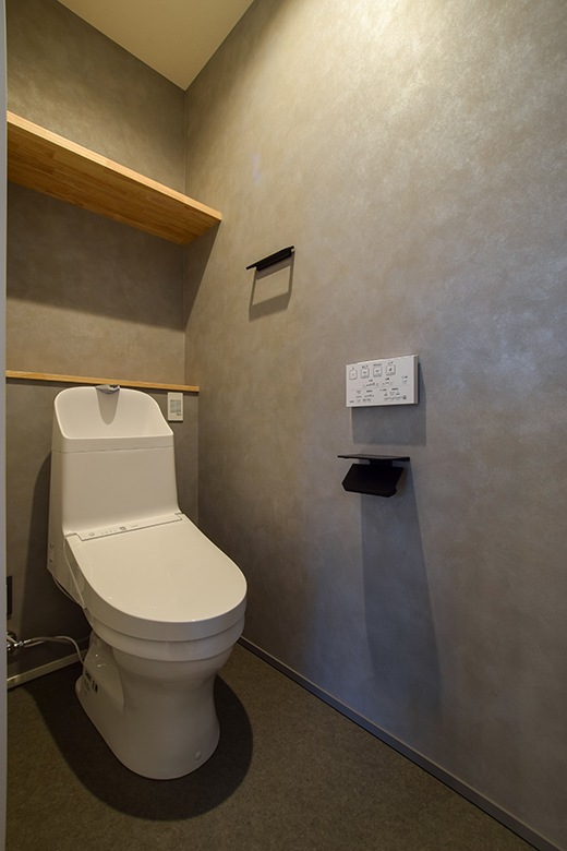 2階トイレは落ち着きのあるスタッコ柄。ここでも紙巻器やタオル掛けの黒が効果的なアクセントに