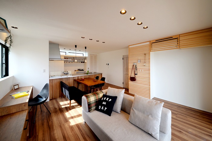新潟市江南区|1.5階の高天井とカーテンレスのLDKで、海外照明と家具が映える住まい|完成見学会【予約制】
