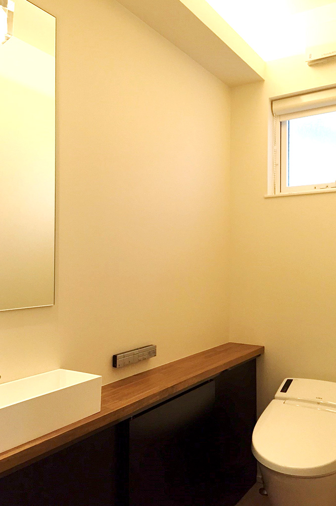 来訪者をもてなすゆったりとしたトイレスペース、デザインと共に実用性を兼ねたつくりを施す。