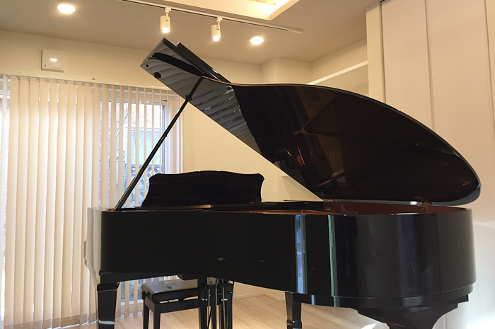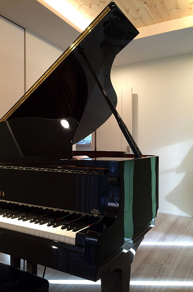 生徒が集うピアノ教室は、部屋全体が清潔感のあるカラーコーディネート。折り上げ天井や照明配置、収納力などが見どころ。
