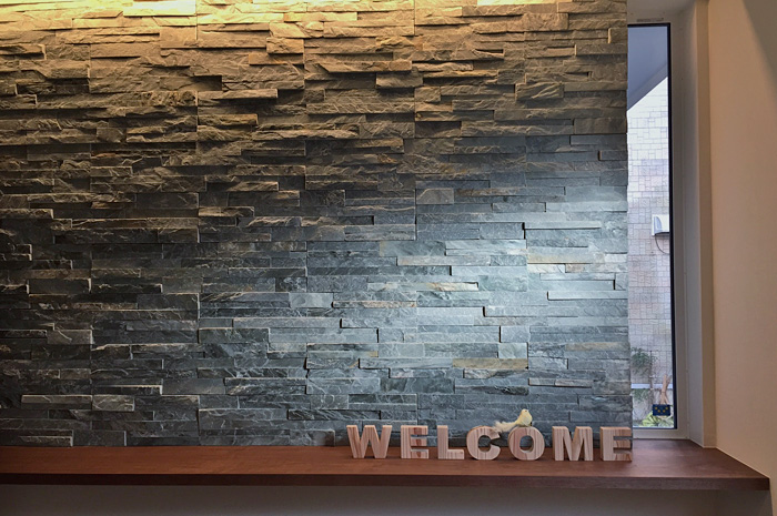 多くの来訪者を迎える玄関ホールに配した、天然石の壁面アクセント。自然光と間接照明で、照らされた壁面の陰影は、昼と夜に違った顔を持つ。