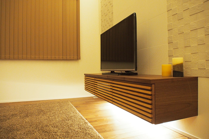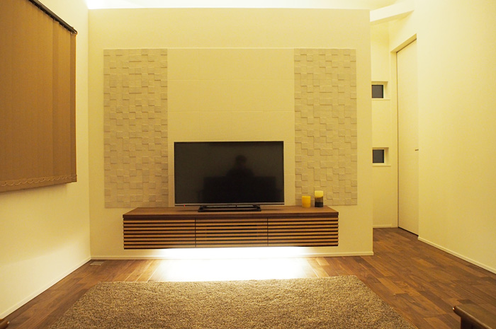 リビングのTVボードは、 ウォ-ルナットの質感と 壁面のエコカラット、 間接照明が相まって、 独特の存在感を醸し出す。
