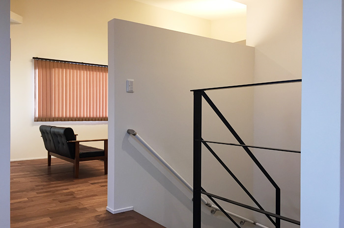 ダイニングテーブルの脚と統一させたブラック色のアイアン手摺が空間に広がりを持たせる。
