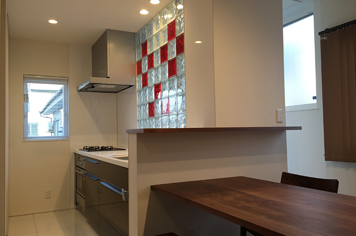キッチン正面には、明かり取りとデザインを融合させたガラスブロックを設置明るいキッチンで毎日の家事が快適に。