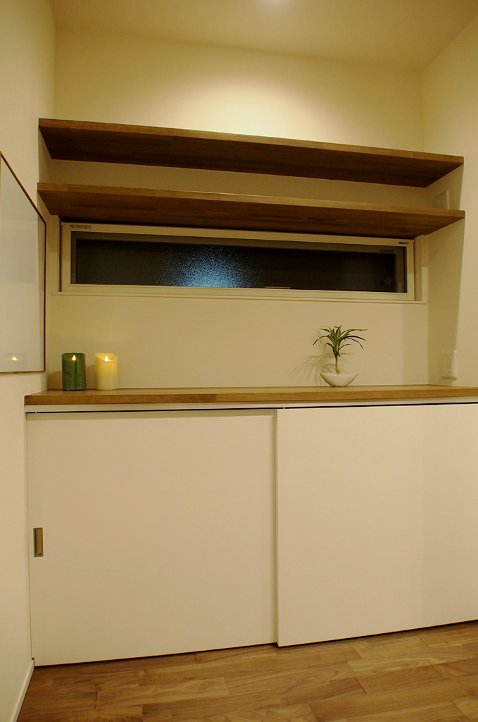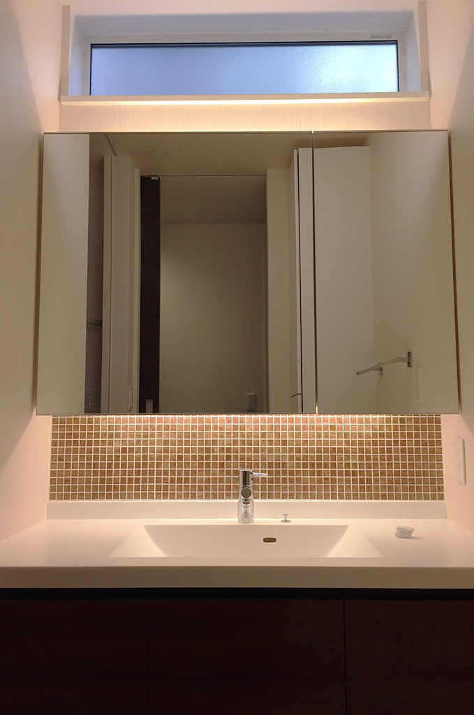 壁面一杯に使った洗面スペース。細かな造り込み一つ一つが、ホテルライクな雰囲気を演出。背面にあるトール型収納で、洗面所内の収納を担う。