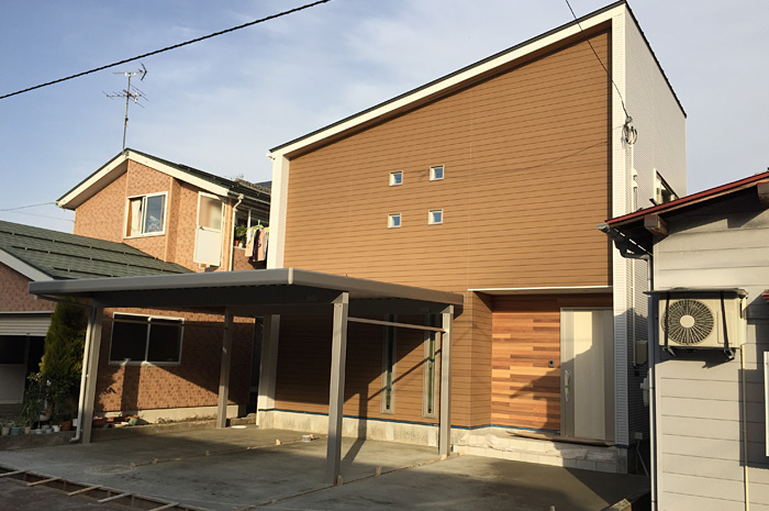 建物正面は、窯業系外壁とレッドシダーで色の統一を出しながらも、質感の違いでアクセントを持たせ、側面には、ホワイトの金属系外壁を用い、明るい印象の建物に仕上げた。