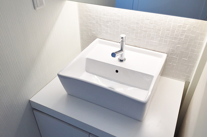 トイレ脇に配置された手洗い器。ホワイトの部材やタイルが、清潔感をもたせる。