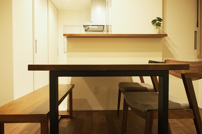 周辺の材質に合わせた、オーダーメイドのダイニングテーブル。キッチンとは、横につながり、スムーズな家事動線の中にある。