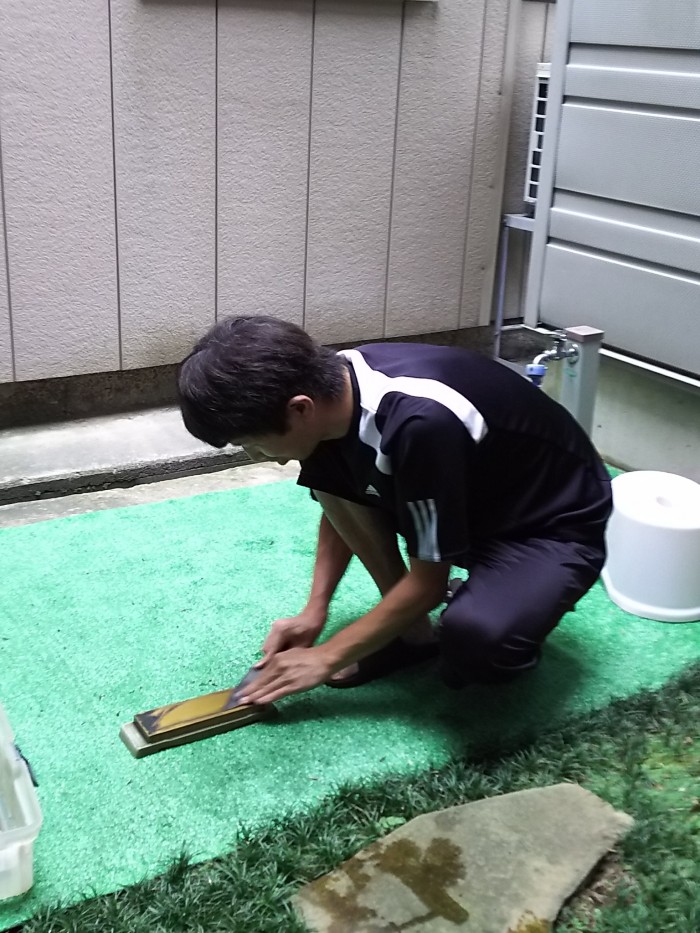 大工をやっていたときに鑿(のみ)や鉋(かんな)も研いでいたので、こなれたもんです。