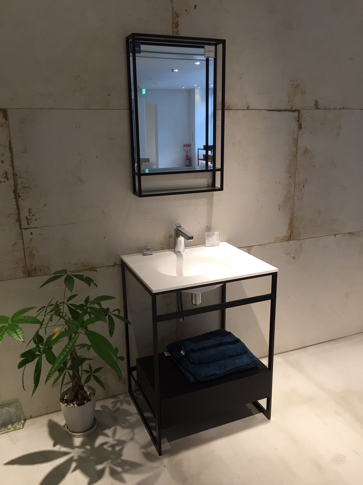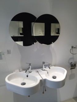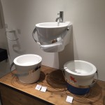 さまざまな設備が展示してありましたが、特に多かったものが洗面ボールやミラーです。弊社でも洗面化粧台を造作する時に使いします。個人的にはバケツ型の洗面ボールと丸を組み合わせたミラーが個性的でとても印象的でした。