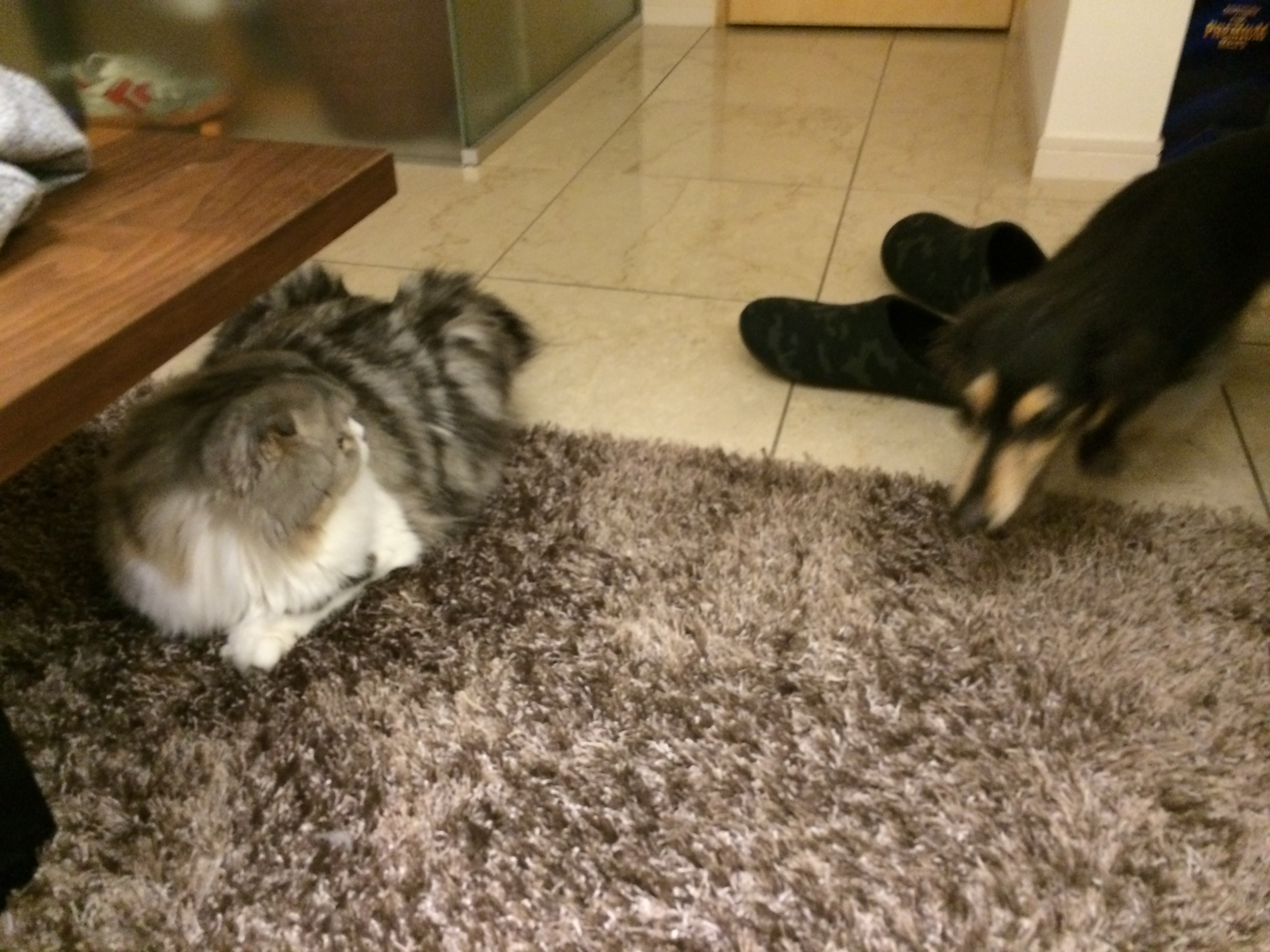 犬と猫は一定の距離感を保ちながら同じ部屋で一緒にいますが、決してじゃれあったりはしません。